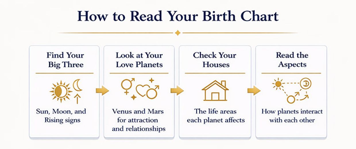 Begin with your Sun, Moon, and Rising signs. These are the building blocks of your birth chart.