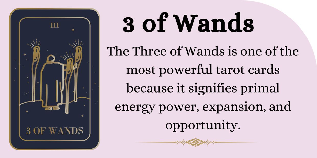 The Three of Wands is one of the most powerful tarot cards because it signifies primal energy power, expansion, and opportunity. It also encourages you to hold a positive approach to life for the future and be patient while waiting for your hard work and determination to produce new opportunities for your life.
